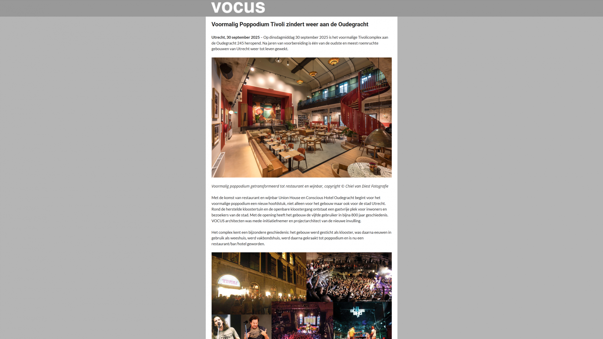 Utrecht, 30 september 2025 – Op dinsdagmiddag 30 september 2025 is het voormalige Tivolicomplex aan de Oudegracht 245 heropend. Na jaren van voorbereiding is één van de oudste en meest roemruchte gebouwen van Utrecht weer tot leven gewekt. Met de komst van restaurant en wijnbar Union House en Conscious Hotel Oudegracht begint voor het voormalige poppodium een nieuw hoofdstuk, niet alleen voor het gebouw maar ook voor de stad Utrecht. Rond de herstelde kloostertuin en de openbare kloostergang ontstaat een gastvrije plek voor inwoners en bezoekers van de stad. Met de opening heeft het gebouw de vijfde gebruiker in bijna 800 jaar geschiedenis. VOCUS architecten was mede-initiatiefnemer en projectarchitect van de nieuwe invulling.