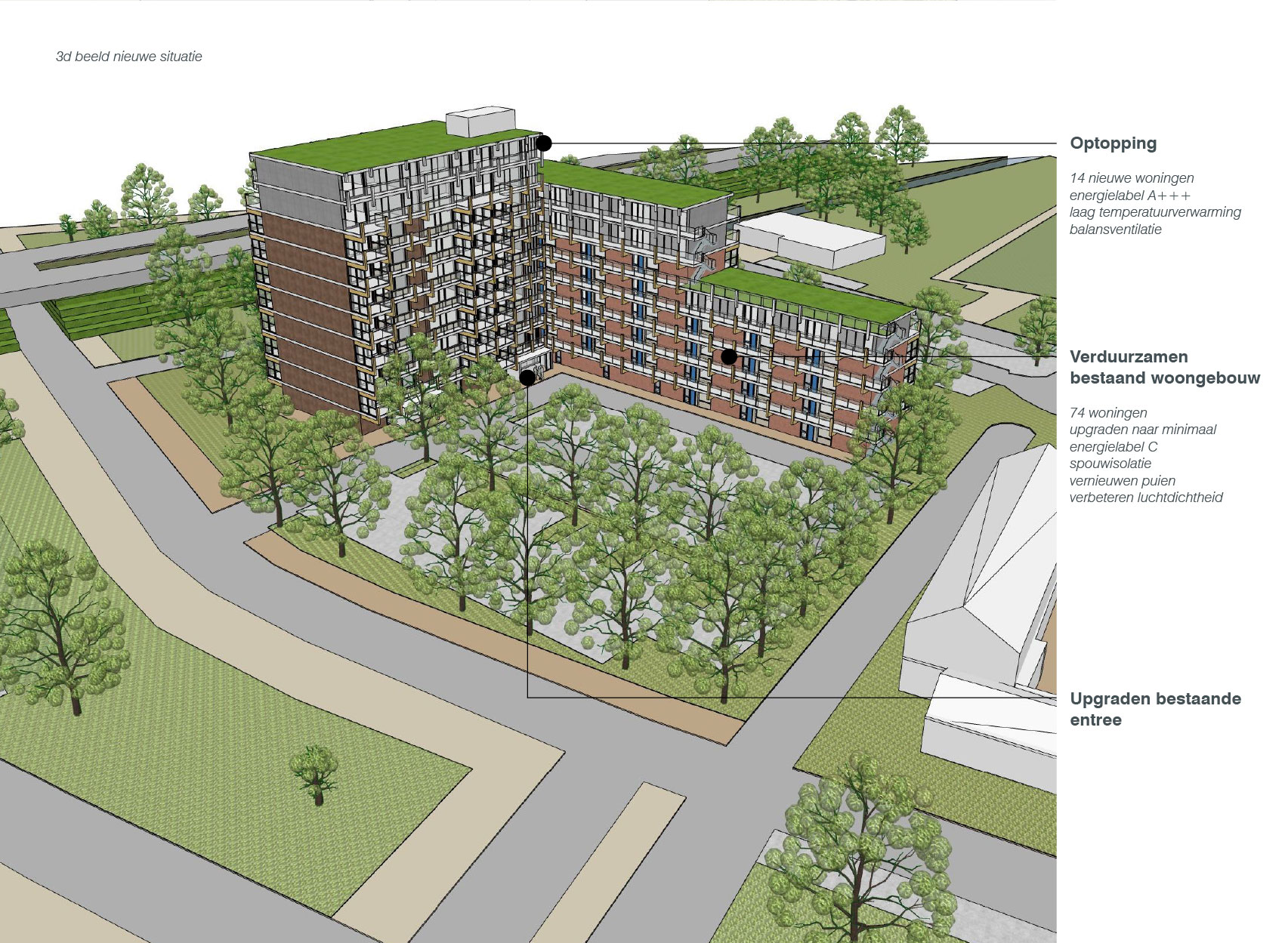 Constructief bleek bovenop dit bestaande gebouw met een betonnen skelet twee extra lagen mogelijk. In de nieuwe woonlagen wordt de structuur van de bestaande woningen doorgetrokken wat resulteert in 18 extra woningen. De architectuur van de extra lagen bovenop het gebouw borduurt voort op de oorspronkelijke getrapte structuur van het gebouw. Bewust is gekozen om het metselwerk niet door te zetten, maar om de nieuwe woonlagen van een glazen afwerking te voorzien. De nieuwe woningen vormen zo een lichte opbouw bovenop de bestaande uitgesproken architectuur.