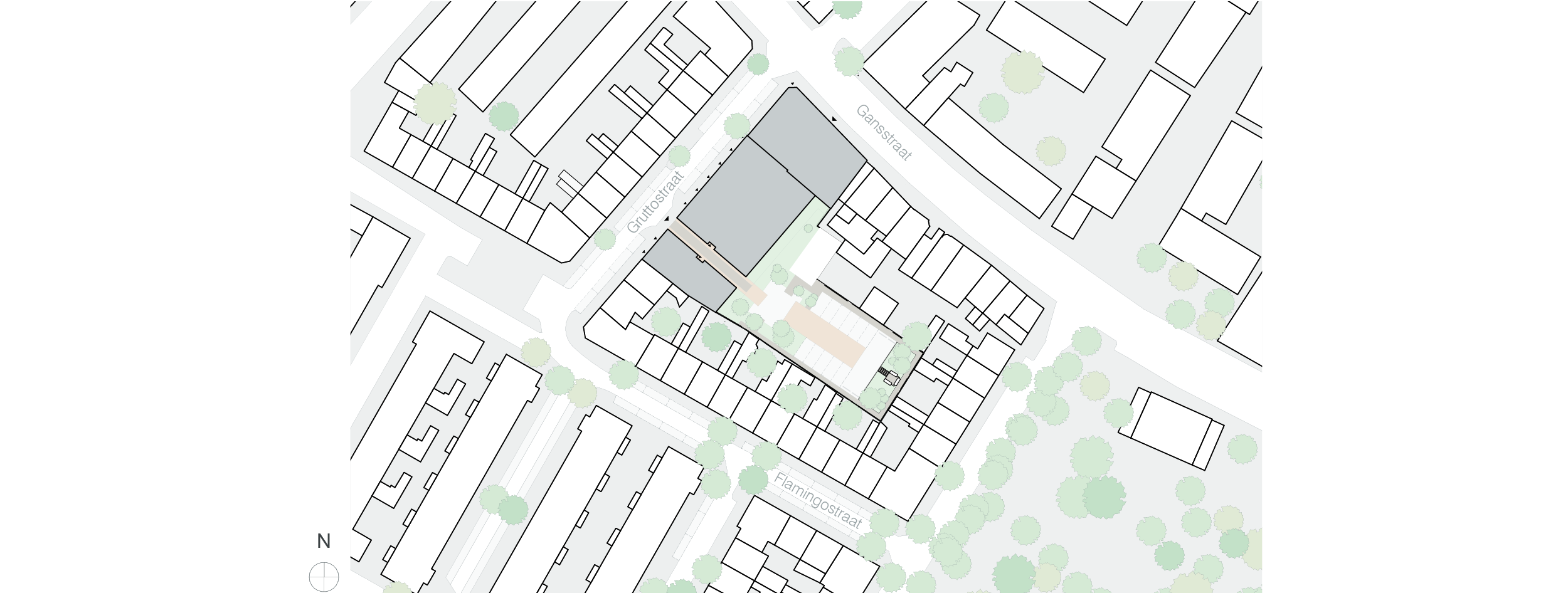Aan de Gruttostraat komt een lang woonblok, met aan de straatkant compacte studio’s, door een binnengang gescheiden van de appartementen die aan de binnentuin zijn gelegen. Aan de tuinkant zorgt liggen tuinen en dakterrassen op het zuiden. Aan de straatkant vormen de raampartijen en dakkapellen samen een compositie. De goot is de horizontale lijn in de gevel die ook terugkomt in de omgeving. Je kunt dit zien als de grondtoon, zoals in een muziekstuk. De regenpijpen zorgen voor de maat, verder ingevuld met hekwerken en vlakken van verspringend metselwerk.